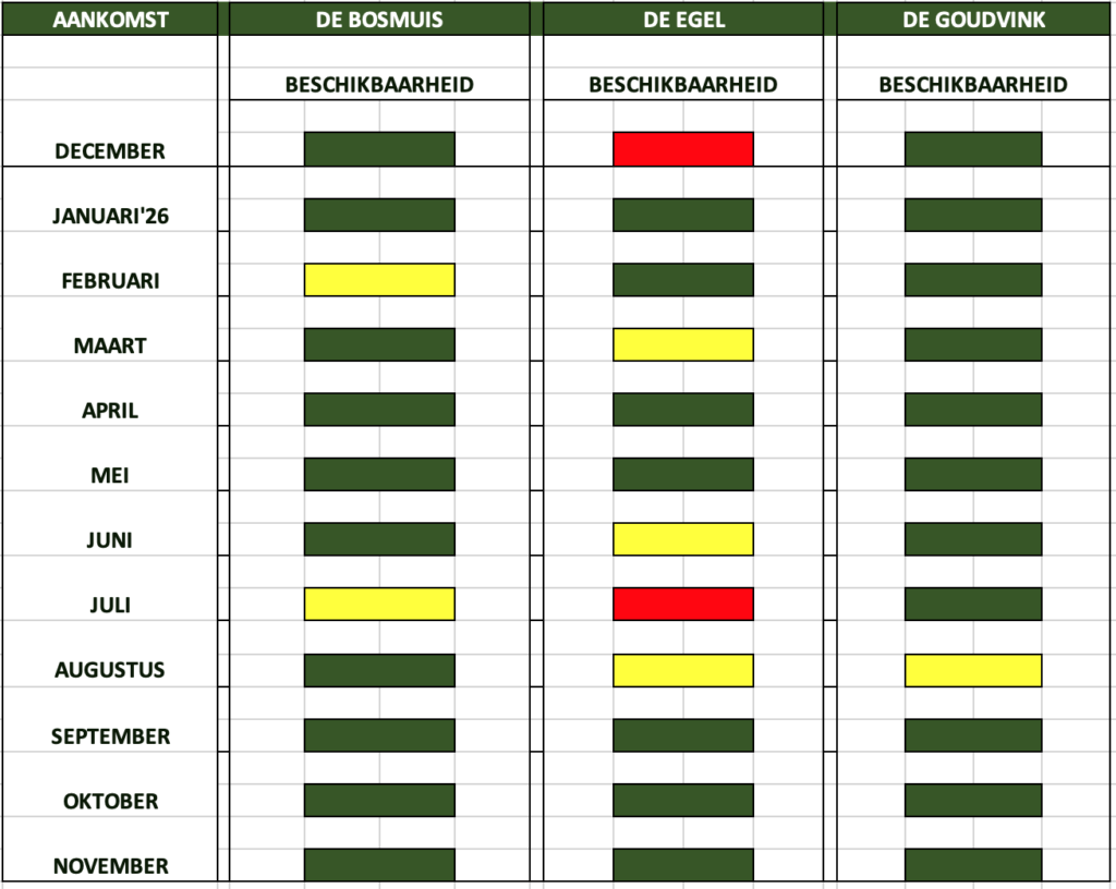 Om het voor u wat makkelijker te maken vindt u in de onderstaande tabel alvast een globaal overzicht van de beschikbaarheid (GROEN = ‘Nog volop mogelijkheden’, GEEL = ‘Nog meerdere mogelijkheden’, ROOD = ‘Helaas niet meer beschikbaar’).